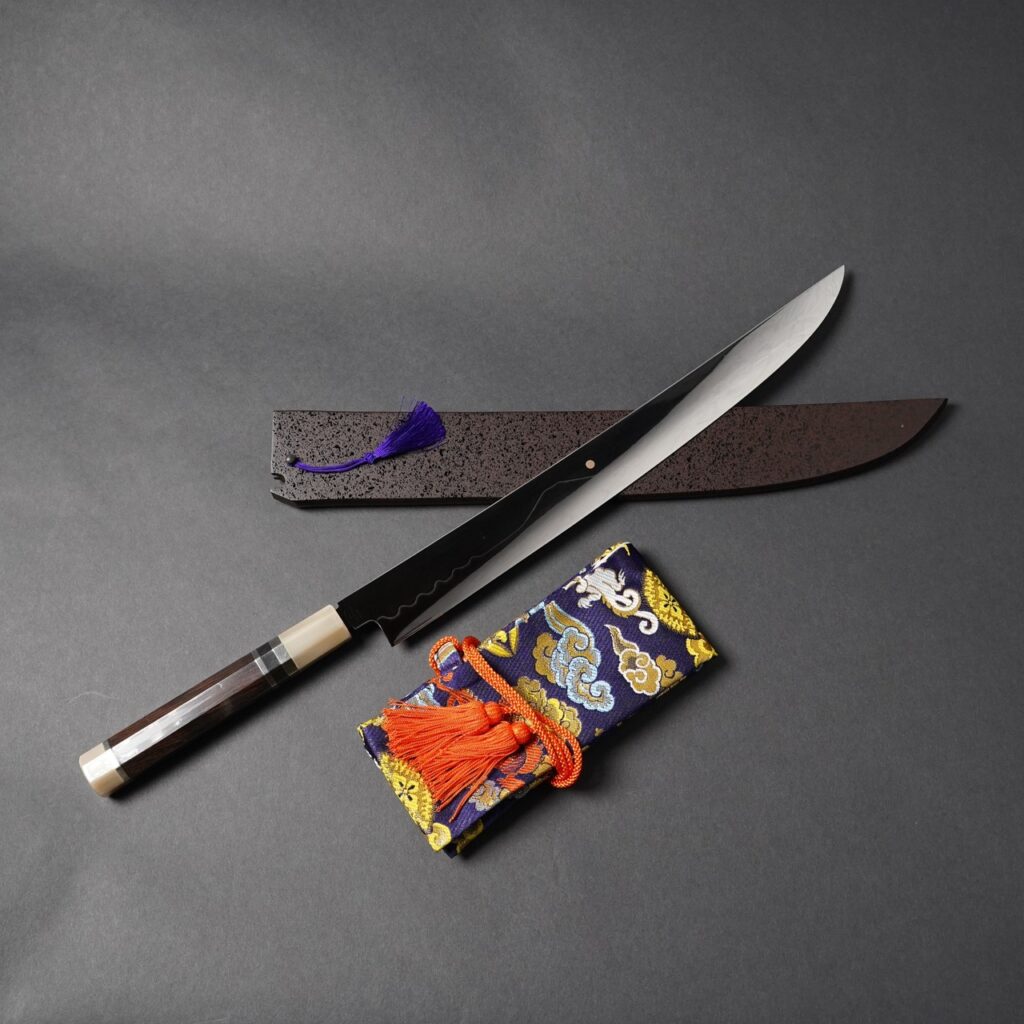 SpecificationSteel Material: Yasuki Hagane, Shirogami #3Method: Oil Honyakiclassification: All mirror FinishHandle: Black Ebony Silver ring white buffalo horn octagonal handleSaya: Lacqured Wooden Cover IncludedBox: Wooden box with silk bagHardness: Approximately 62